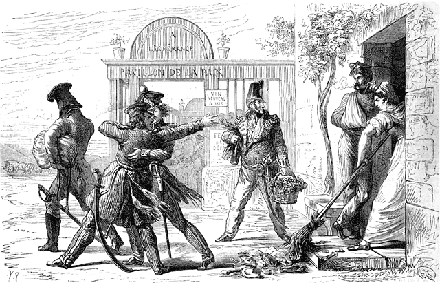 Les plus acharnés contre nous, ceux qui respectaient le moins les propriétés et les personnes, et que la légende devait à jamais flétrir dans nos campagnes, c'étaient les Prussiens. Leur chef, le feld-maréchal Blücher leur avait donné l'exemple des violences, en leur montrant que la France était corvéable à merci.