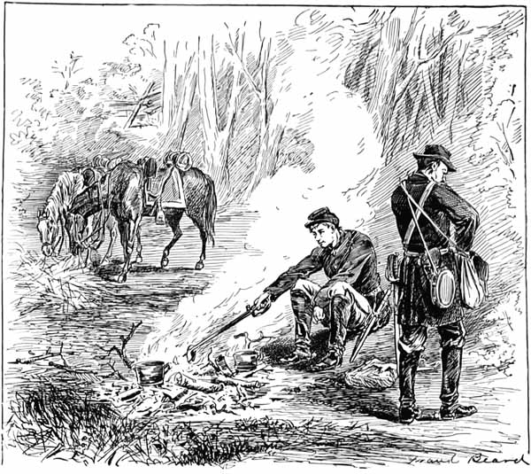 Mrs. Eliza C. Porter, of Chicago, after her eldest son had enlisted, devoted herself to the work, first taking charge of the Sanitary Commission rooms in that city, and in the spring of 1862 going to the army hospitals. At Cairo, she and other women were accustomed to work from four o'clock in the morning until ten at night. They went to the front at Pittsburgh Landing, and not only labored in the hospitals, but did much for refugees and escaped slaves, and established schools for the blacks. In a letter written from a field hospital near Chattanooga, in January, 1864, she says: "The field hospital was in a forest, about five miles from Chattanooga; wood was abundant, and the camp was warmed by immense burning 'log heaps,' which were the only fire-places or cooking-stoves of the camp or hospitals. Men were detailed to fell the trees and pile the logs to heat the air, which was very wintry. And beside them Mrs. Bickerdyke made soup and toast, tea and coffee, and broiled mutton without a gridiron, often blistering her fingers in the process. A house in due time was demolished to make bunks for the worst cases, and the brick from the chimney was converted into an oven, when Mrs. Bickerdyke made bread, yeast having been found in the Chicago boxes, and flour at a neighboring mill, which had furnished flour to secessionists through the war until now. Great multitudes were fed from these rude kitchens. Companies of hungry soldiers were refreshed before those open fire-places and from those ovens. On one occasion a citizen came and told the men to follow him; he would show them a reserve of beef and sheep which had been provided for General Bragg's army, and about thirty head of cattle and twenty sheep was the prize. Large potash kettles were found, which were used over the huge log fires, and various kitchen utensils for cooking were brought into camp from time to time, almost every day adding to our conveniences. The most harrowing scenes are daily witnessed here. A wife came on yesterday only to learn that her dear husband had died the morning previous. Her lamentations were heart-breaking. 'Why could he not have lived until I came? Why?' In the evening came a sister, whose aged parents had sent her to search for their only son. She also came too late. The brother had gone to the soldier's grave two days previous. One continued wail of sorrow goes up from all parts of this stricken land."