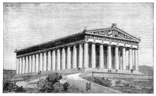 On this rocky height, and on the highest part thereof, was erected the new temple, built entirely of white marble. It was called the Parthenon, and was dedicated to Pallas-Athéné, the patron goddess of Athens. The same divinity was worshipped by the Romans under the name of Minerva. For, just as Ephesus is known to have worshipped especially the great goddess Diana, so Athens devoted herself to the worship of Pallas-Athéné, the goddess of wisdom, the virgin daughter of Jove. She was one of twelve chief gods who were worshipped throughout Greece, but was held as more peculiarly the protecting deity of ancient Athens. A temple to this goddess had stood on the self-same spot before the war, which the Persians had destroyed. The former one was called the Hecatompedon, referring to its size.[1] The new one, the Parthenon, was the house (or chamber) of the virgin.[2] It was to be used for festivities and ceremonies in honour of the goddess, rather than for worship. It was of the same size as its predecessor, and was for that reason occasionally, but very rarely, called by the older name. The building of this temple was commenced 445 B.C., soon after the happy termination of the Persian war, while peace and prosperity ruled in the land. It took ten years to complete, and was accordingly finished in 435 before the Christian era. The times were therefore pagan times; but a great wave of civilisation passed over the favoured land of Greece, to which all modern art and literature owes so much; and the worship of Athéné, the goddess of wisdom and activity, takes its place amongst the purest and most elevating of the heathen religions.