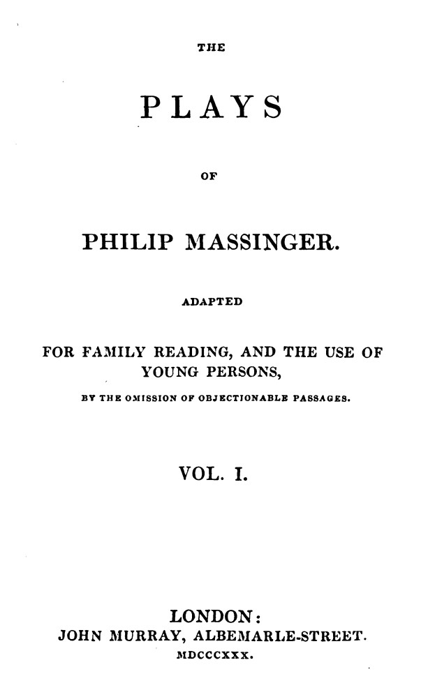 The Old English Dramatists, the friends and co-temporaries of Shakspeare, have contributed one of the most valuable portions to the poetic literature of our country. But—abounding as they do in wit and fancy, in force and copiousness of expression, in truth and variety of character, in rapid change of incidents, in striking and interesting situations, and, above all, in justice and elevation of sentiment—their works are totally unknown to the generality of readers, and are only found in the hands of an adventurous few, who have deviated from the beaten paths of study to explore for themselves less familiar and exhausted tracts of literary amusement. The neglect of these authors, in an age so favourable to works of imagination as the present, can only be ascribed to that occasional coarseness of language which intermixes with and pollutes the beauty of their most exquisite scenes. For what may be termed the licentiousness of the stage, for immorality of principle, for that offence which was transplanted from France to England with the court of Charles the Second, our old dramatists do not require the aid of any apologist. They are innocent of attempting to confound the notions of right and wrong, or of seeking to influence the bad passions of our nature against the first great principles of morals. These were the corruptions of a later and more vicious age. With the earlier play-writers, the bent of the story and the interest of the spectator are always directed to the side of virtue; but the objection against them is, that though they armed themselves in her cause, they were too little scrupulous what kind of weapon they employed. The worst things are always called by the worst names. Nothing is sacrificed to delicacy. The grossest subjects are treated, whenever they happen to occur—and no care is taken to avoid them—in the grossest terms. Vice loses none of her enormity by any diminution of her coarseness. If the wicked are introduced, they are painted with a perfect truth of nature; they are represented as loathsome in language as they are detestable in conduct; and are rendered as offensive to the reader of cultivated taste and virtuous habits as they would be in the actual intercourse of life. However well it may have suited the less polished age of Elizabeth and James thus to inculcate purity by exhibiting all the corruptions of the depraved, and to fortify the moral principle by portraying wickedness, with all its hateful accompaniments, as an object of disgust as well as abhorrence and contempt, such strong pictures are no longer tolerable at the present day, and the recurrence of them militates against that general circulation and approval which is otherwise due to the great merit of the works in which they occur. Under these circumstances, the Editors of the Family Library have determined on publishing a selection from the plays of Massinger, Beaumont, Fletcher, Ford, Shirley, Webster, Middleton, and others, omitting all such scenes and passages as are inconsistent with the delicacy and refinement of modern taste and manners. Whenever it is possible, the play will be printed entire. If there be a double plot, the one, as in the case of the Virgin-Martyr, eminently beautiful, and the other as eminently offensive, the living beauty will be separated from the dead weight of corruption to which it is unnaturally joined, and be presented to the reader in a form which may afford an unmixed and flowing enjoyment to his imagination. When there is a radical evil in the groundwork of the play, only a single act or a few scenes may be given; but, in such cases, care will always be taken to preserve the interest of an entire and connected story.