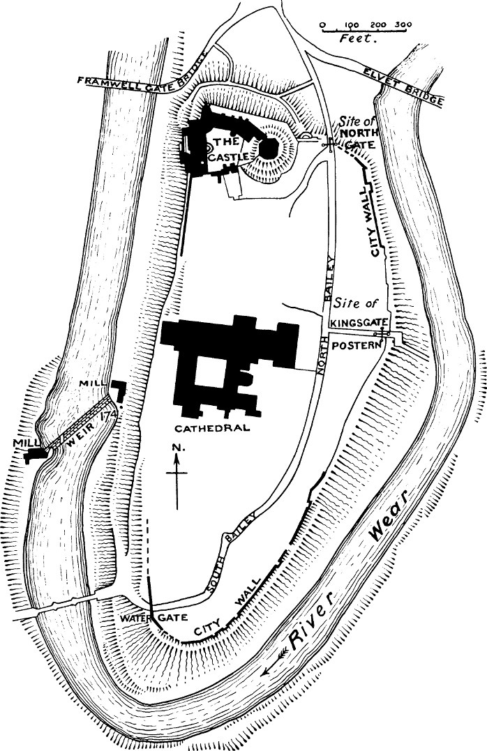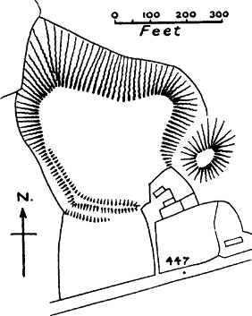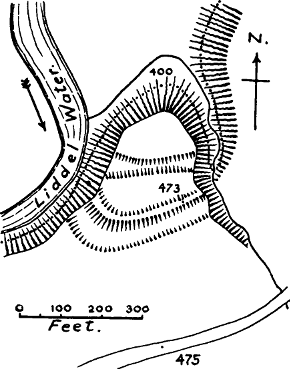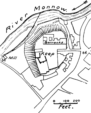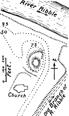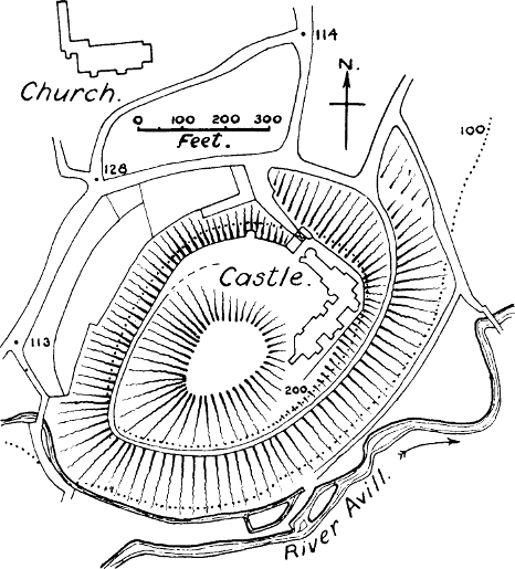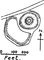 These are the main features of the earthworks in question. Some variations may be noticed. The ditch is not invariably carried all round the hillock, occasionally it is not continued between the hillock and the court.[6] Sometimes the length of the ditch separating the hillock from the court is at a higher level than the main ditch.[7] Often the ditches were evidently dry from the first, but not infrequently they are wet, and sometimes vestiges of the arrangements for feeding them are still apparent. The hillock is not invariably artificial; often it is a natural hill scarped into a conical shape; sometimes an isolated rock is made use of to serve as a citadel, which saved much spade-work. The shape of the court is very variable: it may be square or oblong, with greatly rounded corners, or it may be oval, or semilunar, or triangular; a very common form is the bean-shaped. The area covered by these fortifications is much more uniform; one of the features contrasting them most strongly with the great prehistoric “camps” of southern England is their comparatively small size. We know of only one (Skipsea) in which the bailey covers as much as eight acres; in by far the greater number the whole area included in the hillock, court, and ditches does not exceed three acres, and often it is not more than one and a half.[8]