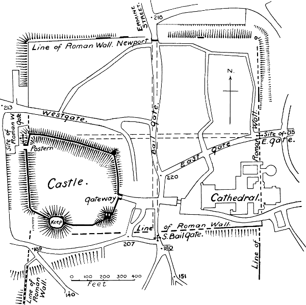 [1194] The walls of the Tower are from 12 to 15 feet thick at the base; those of Norwich 13; the four walls of Dover respectively, 17, 18, 19, and 21 feet; Carlisle, 15 feet on two sides. (Clark.) William of Worcester tells us that Bristol keep was 25 feet thick at the base! Itin., p. 260.