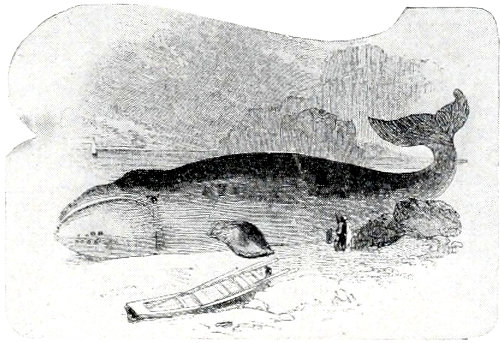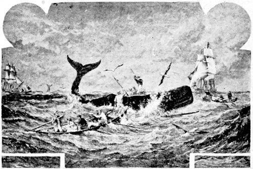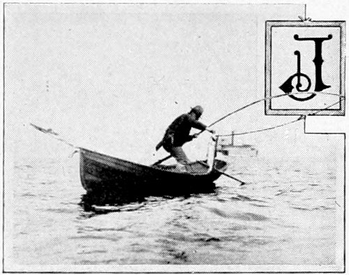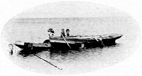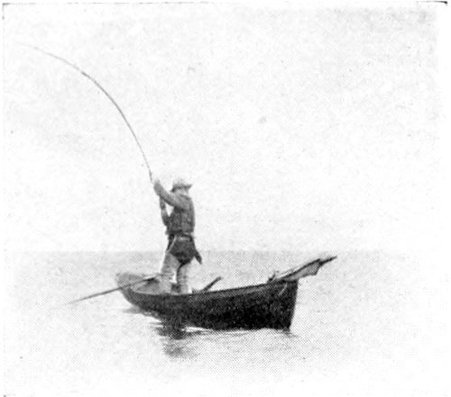 “I stood up and threw out a herring. In a moment it was grabbed. Then the baited hook went over, was seized in a trice, and once more we had a fish. This second fellow was even more lively than the first, and his rushing and jumping was something wonderful to witness. He began pulling us off at once. To make his speed less we crossed our oars and held back water, which acted like a drag. Suddenly like the other, he turned at right angles and led us off in the new direction, fully ten minutes. Then he headed for the boats—mischief in his eye. We were now threatened with mishap worse than before, for the boats were by this time deeply loaded. What was to be done? He made another leap at this juncture, falling more clumsily than before. He was weakening! The men in the boats were now gesticulating and yelling for us to set him free. But we were growing hopeful as the speed of the boat grew perceptibly less. Soon we were able to gather in line to within a few fathoms of him. Within 150 yards of the boats he stopped short. We hauled up. What a beauty! Ten feet long, and weighing over 600 pounds. Three cheers were given as with a rope through his gills we towed him to the beach. We gave him to the men whose herrings we had spilled. Surely a royal sport. The equal of any fishing on the Pacific Coast.”