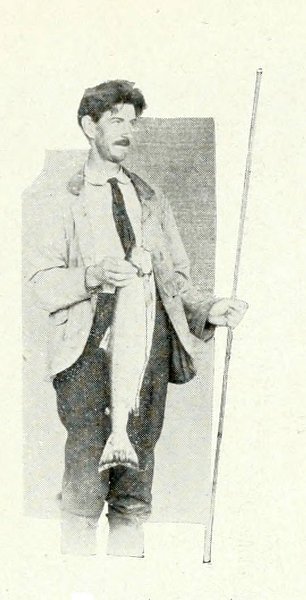 “Stout cod-lines were used, 32 fathoms long. The hook was of steel, three-eighths of an inch thick. It was eight inches wide, 283 and had a three-inch shank. A stiff, moderately low boat was used, and the lines were attached to swivel reels to run them on and off. Herrings were taken for bait. We started off and soon reached the fishing ground. Presently one of the fishermen casting nets nearby called out to us, ‘Halloa, boys! here’s a fellow!’ meaning an albacore, followed by a shout from another, and still another that they were about their boats; so we slowly moved outside the range of the boats, throwing over a herring every few yards to toll them along with us. When far enough away we secured the reel to the boat athwart, for we were a bit afraid of the fish we expected to grapple with. Then I threw over a herring to see if there were any albacores near us, and to our delight a monster rushed for it just under the surface, so I threw another loose herring, and then one attached to the hook. He rushed for the first one, whirled and took hold of the other, and we had hold of him. Then for a few minutes we had a good imitation of the antics of a wild prairie horse when first haltered. He jumped his full length out of the water, which gave us a very vivid idea of the monster we were attached to; then he started at an awful pace across the harbor. The line was running out swiftly, so that we had to move as quickly to get it into the notch in the stern, which we had wisely thought to make. Then I seized an oar and placed it for steering, while we both got positions to trim the boat. We feared something might break if the boat remained motionless; so to obviate this my friend succeeded in grasping the line partially, and thereby gradually started the boat, while I helped by sculling, so that by the time it was all off the reel, she was moving faster than ever she did before. The fish kept up the pace for at least ten minutes, towing us directly into the harbor; then he made a jump, turned and took us straight back to the fishing grounds. The men in fishing boats had been watching us with great interest, not supposing for a moment they were to have any part in it; but when they saw us going directly for them, the shouting and hooting and swearing that suddenly started from them would have been laughable to disinterested spectators. We could see plainly that if he continued the course he was then taking us, nothing short of a collision with one or more of the boats would follow.