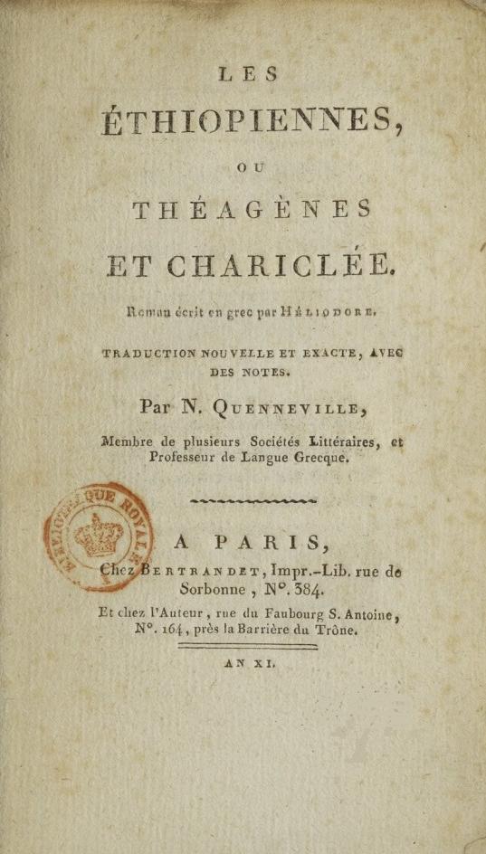J'en ai une anonyme sous les yeux, qui fait partie de la collection des Romans grecs, réimprimée en l'an 4: je soupçonne que c'est celle d'Amsterdam. Elle n'a pas le mérite de l'élégance, et encore moins celui de l'exactitude. L'Auteur a ajouté, a retranché à sa fantaisie; il a habillé Héliodore à la moderne. La multitude de contre-sens dont sa traduction est remplie, fait même douter qu'il ait entendu la langue de son auteur. Je ne parle point des traductions étrangères que je ne connois point.