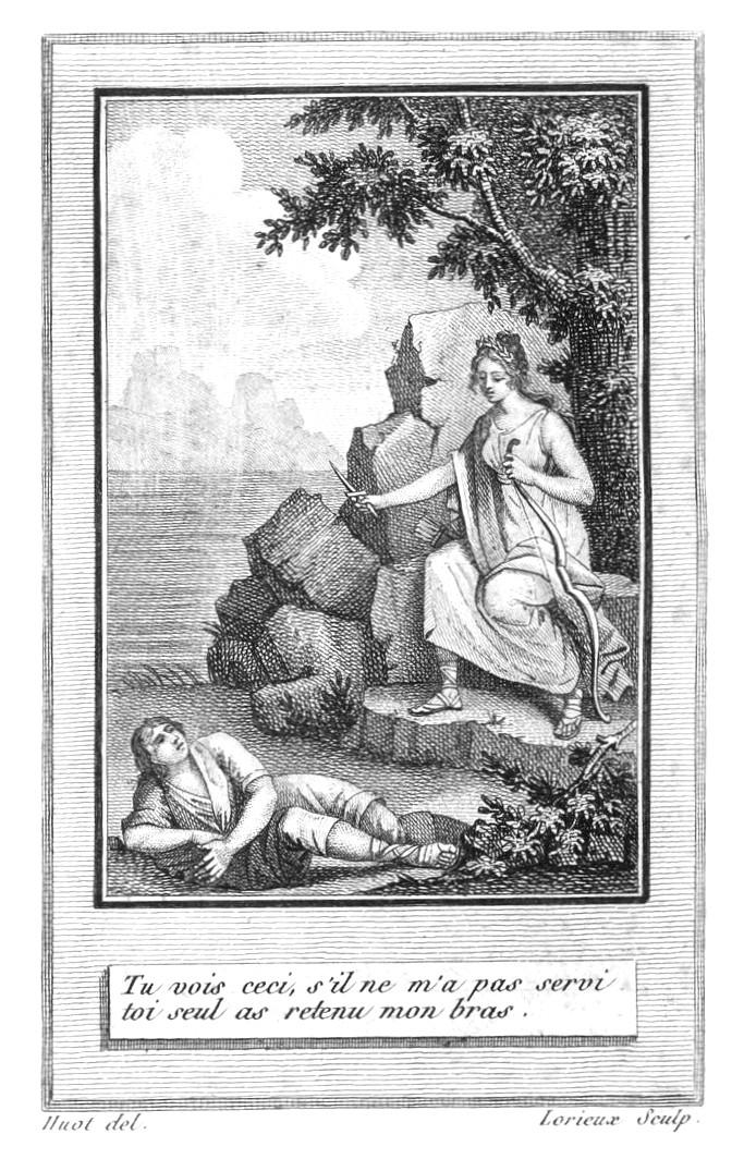 Sur un rocher est assise une jeune fille d'une beauté éblouissante. Ils la prennent pour une déesse: elle est plongée dans une douleur profonde. La majesté d'une naissance illustre brille sur toute sa personne; une couronne de laurier lui ceint la tête: un carquois descend le long de ses épaules; son bras gauche est appuyé sur son arc; sa main pend négligemment; l'autre, appuyée sur sa cuisse droite, soutient sa tête, qu'elle lève de tems en tems, cherchant des yeux un jeune homme, étendu sur la poussière à quelque distance.