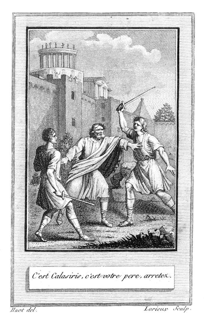 Je fais tout ce qu'elle me recommande; je m'arme d'un poignard; Thisbé, un flambeau à la main, guide mes pas à l'appartement de mon père. J'apperçois briller une lumière dans l'intérieur. Transporté de fureur, j'enfonce la porte, et me précipitant dans la chambre: où est-il, m'écriai-je, ce lâche séducteur, ce bel amant d'une femme si sage? en même-tems, je m'avance pour les percer tous deux de mon épée. Grands dieux! mon père s'élance hors du lit, tombe à mes genoux: arrête, s'écrie-t-il, ô mon fils! épargnes celui qui t'a donné le jour, qui t'a élevé; prends pitié de ces cheveux blancs[3]. Je t'ai outragé; mais la mort seroit une vengeance trop cruelle: ne suis pas les mouvemens impétueux de ton ressentiment; ne rougis pas tes mains du sang de ton père.