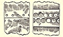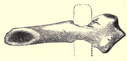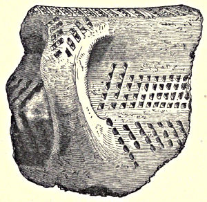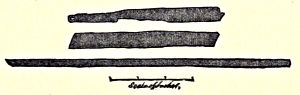 [246] The “finds” on Reed Island were, a whetstone, and fragments of another; a slab of sandstone (probably the hearth); a piece of iron, seemingly portion of some cutting instrument; a quantity of wood-ashes; a circular wooden noggin, with a small round handle; the handle of another vessel; some bright-red colouring matter, rolled up in a piece of birch bark. Near the outside piles were bones of the ox, sheep, and pig, all very much broken and gnawed.