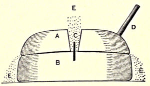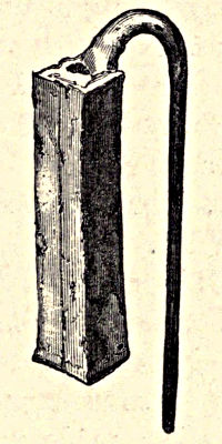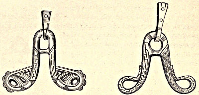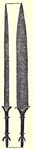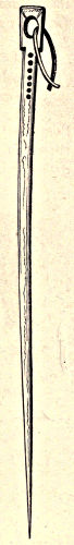 “Solinus relates that the Irish formed the handles of their swords from the teeth of large sea-monsters which they polished to a most beautiful whiteness.” “That the handles were very much smaller than those of modern swords with guards, and used for cutting as well as thrusting, there can be no doubt, yet some of them are large enough to receive a moderate-sized hand. Without discussing the generally received opinion that the men who used such swords had very small hands—like some of the Asiatics of the present day—the mode of using these weapons must not be forgotten. They were employed for stabbing and fencing, in which the middle, ring, and little fingers alone grasped the handle completely, while the thumb and fore-finger passed upwards on each side of the blade, fitting into the curved hollows of the hilt—and not like the method of the cavalry soldier of the present day, who, when about to deal a heavy blow, grasps his weapon with the closed hand, which must occupy a space of about four and a-half inches.”—Cat. Mus., R.I.A., p. 456.
