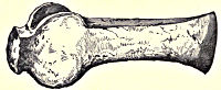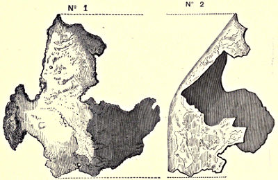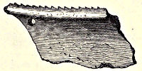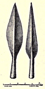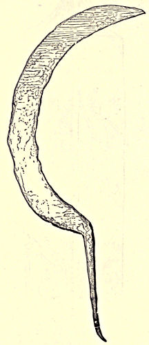 [196] In the kitchen-midden was the ordinary complement of bones, principally those of the ox, boar, sheep, goat, dog, and deer. Seven short scythes of bronze, a plough-sock of iron, a plough-share of flint, several iron spear-heads, and some pins, were also brought to light.