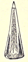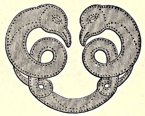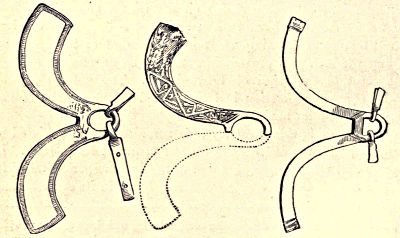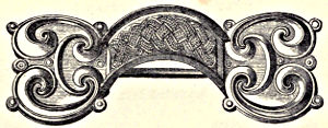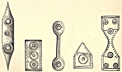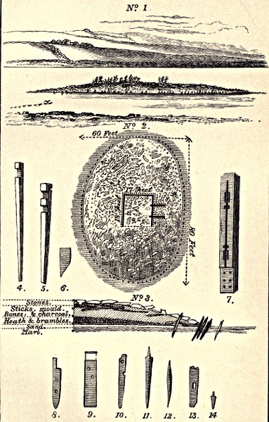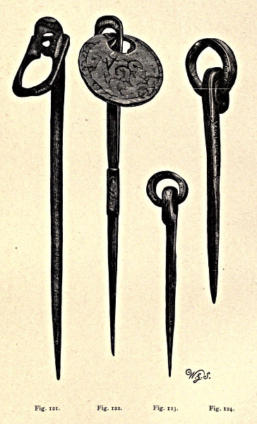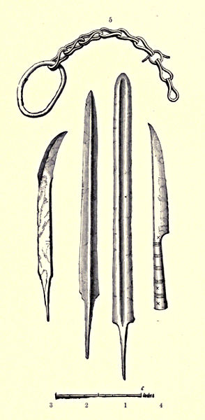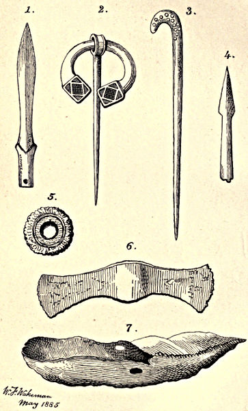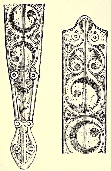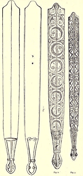 [228] And also the following antiquities:—A small stone, on which was carved a headless naked human figure. A sandstone ring. Several whetstones. A dark-coloured piece of shale and sandstone, three inches across, marked on the surface like the “game stones” in the Museum, R. I. A. A mould, formed of agalmatolite or potstone; on one side it had a circular cast for a harness stud. A decorated bone comb, and portions of eight others. Many curious bone pins (described ante “Articles of the Toilet,” &c.). A spatula-shaped bone (ante, p. 140). Flat pieces of ornamental bone (p. 139). A bone knife or skean, highly decorated on the handle and along a portion of the blade. A knife and fork of bone, colour dark brown; the handles are square, and decorated with the domino pattern. Several miscellaneous bone articles, consisting of pins, handles, knives, &c. Bronze tweezers, and several ornamented bronze pins. An admirably-designed brooch, or brooch-pin, of findruin or white bronze; its ring, two inches in diameter, was a mass of spiral ornamentation, pointing to an extremely early age. A very perfect short-bladed bolt-head, with narrow loops. A narrow dagger-blade, with high mid-rib and ridge on handle-plate. Amongst the iron remains there occurred, swords, varying in length from six to eighteen inches, axe-heads, spear-heads, shears, bodkins, and many small articles of domestic use.