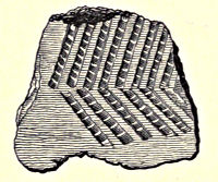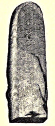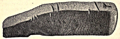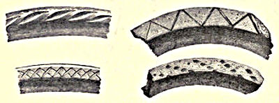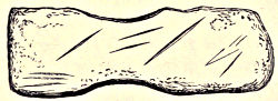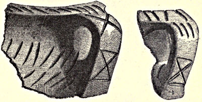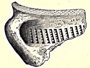 [186] Also the following articles: a circular stone not unlike the upper stone of a pot-quern; it was perforated in the centre, and decorated at the top. A small whorl of red grit, and a water-worn pebble that may have been used as a net weight or sinkstone (a). A whetstone, four inches long (a). A curved stone, five inches long, bearing on it some rudely carved devices (a). A celt-shaped, smooth, flat stone, about six inches in length, evidently a natural formation (a), and much resembling the modern polished stone used by linen weavers as a “rubbing-stone.” Two fragments of pottery, exceedingly rude, one of them unglazed (a): the first is portion of a small pipkin, between three and four inches wide, and two and three-quarter inches high, with an indented band round the top; it bears marks of the long-continued action of fire, and is in composition very like a cinerary urn.
