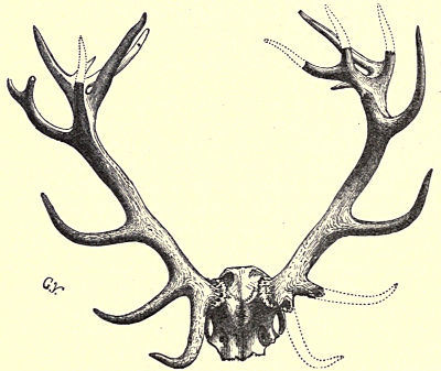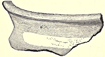 [191] There were also shears of various sizes; two well-formed needles of bronze; a shoemaker’s awl with blade of bronze and handle of stone; several axes or hatchets; a light spade of wood tipped with iron; an iron sword; a horse-shoe of ordinary size, thicker at the outer edge and without raised heels, but drawn out at the extremities to a great length; many whetstones; knives, very narrow and sharp at the point, but thick on the back; a bronze dish much scored, its diameter fifteen inches, including the rim; a wooden scoop; a large bead and small crescent-shaped piece of glass, which bore marks of having been set as a jewel; several pins of bronze, iron, bone, and wood, varying greatly in shape; the fragments of pottery were evidently the remains of strong, well-shaped vessels; the bones and horns of mammalia were principally those of oxen (of short-horn species), sheep, goat, deer, and dog; there were tusks of the boar, and in one instance the skull of a Cervus Elephas showed that the horns had been sawn off. In the museum of the College of Surgeons, London, is preserved the skull of an Irish deer from which the horns had been similarly cut, and it is said to have been found in that state in the west of Ireland.—Journal Royal Hist. and Arch. Asso. of Ireland, vol. iii., pp. 86, 90; vol. iv., pp. 36, 38.—E. Benn.
