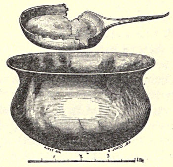 The following are a few of the articles found on this site, and nearly all are now in Museum, R. I. A.:—Two double-edged swords of iron. A curved blade. A peculiar single-edged weapon. An iron ring and chain, supposed to have formed portion of a manacle (plate VIII., p. 61). Two spear-heads in fine preservation (p. 63). An axe-head (p. 68). A bowl and a ladle (p. 85). A small single-edged knife. An iron pipe, with hook attached. A bronze object of unknown use (p. 143). Three armillæ of rude fashion; one of them formed of a thin plate measuring rather more than half an inch in diameter; the extremities slightly recurved. An ornament of mixed metal, and an enamelled plate of iron (p. 138). Portions of a small ring fibula, with cavities in the metal in which enamel appears to have been encrusted. Numerous bronze pins of various sizes and fashion. A skean or dagger (p. 65). A thin triangular blade, corroded at edges; the lower portion prolonged into a tang; the bevel on the edge, continued round the flat handle-plate, shows that the article was cast and not subsequently hammered out. A very rude piece of bronze somewhat resembling a broad arrow. A sling stone of quartz rock. An oblong or natural kidney-shaped stone, five inches long, and rounded at the extremities. Several whetstones. Two bone needles or bodkins, perforated at the extremity. A double-toothed comb, rudely ornamented with lines and concentric circles; and other combs, or fragments of same, one of them being a small perfect specimen, four inches long. A horn tine, polished at top. A very small four-sided drinking vessel of horn, two and a-half inches high. A polished leg-bone of a deer, curiously carved. A wooden spike, broad in the middle, and sharpened at each end; it is supposed to belong to the weapon class. There were also amber, jet, glass, and enamelled beads, now in the Museum, R. I. A.