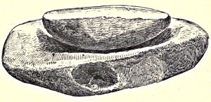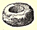 [220] In addition to the usual collection of bones, the articles obtained from the crannog were as follows:—A large stone, hollowed in its upper surface, used evidently for crushing corn, the rock forming this crusher, being coarse basalt, is foreign to the district; it appears to be portion of a block of columnar basalt, brought to the spot probably from the N. E. of Ireland. There was another large stone of a carboniferous grit foreign to the locality, evidently the upper stone of a grain-rubber; it was slightly convex on one side, and had an artificially-polished surface. Two round stones—the one of quartz, the other of carboniferous grit. Three pieces of spoon-shaped flint. A stone ring, made from the ordinary greywacke shale of the district; it was too small for the finger. Part of another ring, somewhat larger in size. A bead of glass, and one of amber. Portion of a jet bracelet. Some articles of brass, comparatively modern. Fragments of pottery (undescribed). A crucible. An article formed of baked clay, two inches in length by one in breadth, having one of its surfaces convex, and the other concave; it bore the mark of a cross near one of its extremities. Several pieces of iron ore; and a bronze axe that was discovered in 1843 on the shores of the lake in the immediate vicinity of the crannog.