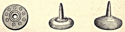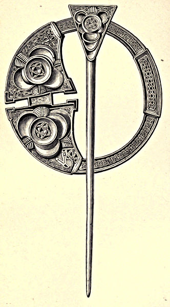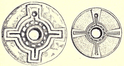 [230] Not far from Tullamore, on the direct route from the crannog of Lough Annagh to Killeigh, and under a considerable depth of bog, was found a very fine bronze pin, eleven inches long; it tapered to a sharp point at the end, and was headed with a disc, one and a-half inches in diameter, having an obtusely pointed boss in the centre.