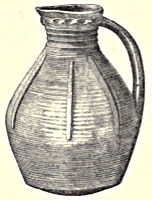 [216] There were also found here a pair of quern-stones; burnt corn; numerous fragments of coarse earthenware vessels; fragments of thick dark glass; an earthen pot; a “grey-beard,” with the representation of a man’s head beneath the spout; worked oval stones; “spindle-whorls”; hones of different shapes and sizes; a brass token, almost defaced.