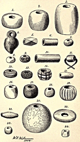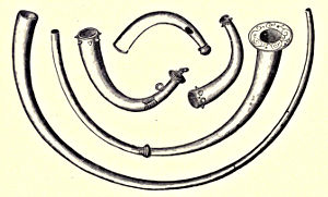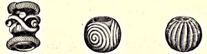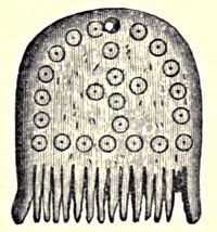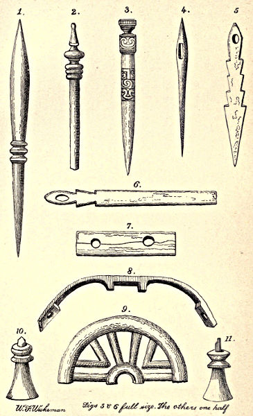 | Pins of iron, bronze, bone, and wood, &c. Iron shears and knives. Combs of bone and wood. Bronze tweezers. Stone and bronze ornaments: brooches, penannular rings, circlets, &c. Touchstones. Crucibles. Ornaments of gold and silver. Rings of stone, jet, and glass. Beads of stone, bone, jet, lead, earthenware, wood, and glass. | |