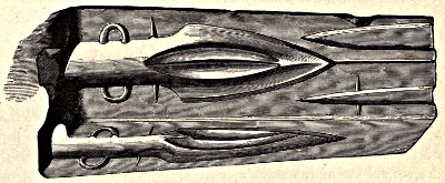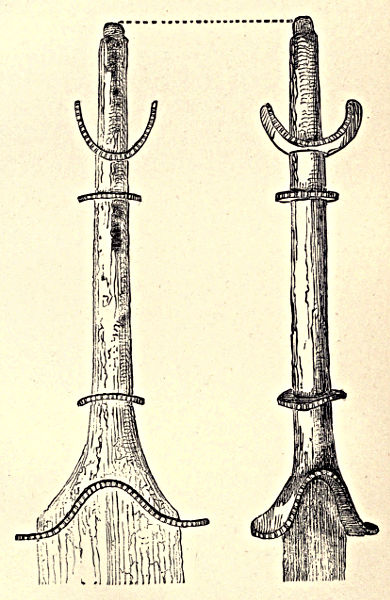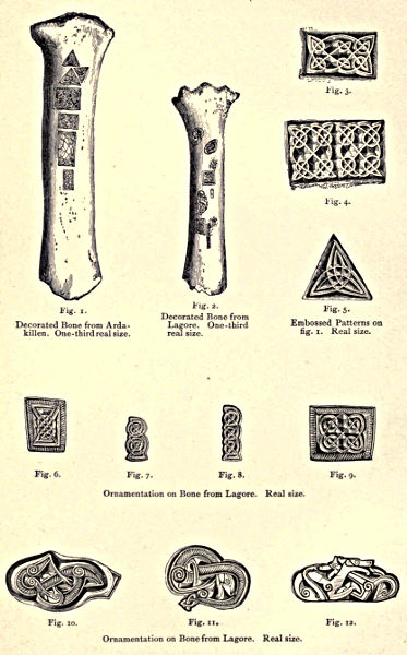 [256] The following “finds” from Ardakillen are deposited in the Museum, R. I. A.:—Numerous bone pins of various sizes and designs; twenty-two combs or fragments of same; a bone dart, six and a-half inches long; do., five and a-half inches long; do., four and three-quarter inches long; do., five inches long; a curved piece of deer’s horn, hollowed at the base, and another piece slightly longer; a tine of deer’s horn, hollowed at base; numerous harp-pins of bone (one is figured, ante, p. 125); a curious ovoid piece of bone, polished (ante, p. 105); the leg-bone of a deer, covered with carvings (plate XXXII.); a bronze brooch (ante, p. 117); a small slender torque-pattern ring (ante, p. 118); a bridle-bit (ante, p. 137); several whetstones; a very perfect, thin, narrow rapier-blade, double notches in handle-plate; beads of stone, bone, wood, porcelain, glass, and amber; numerous bronze pins; an oaken water-scoop, with a hollowed-out handle; a wooden mallet; some ogham-inscribed wooden objects.—Journal Royal Hist. and Arch. Assoc. of Ireland, vol. iii. (4th Series), p. 206.