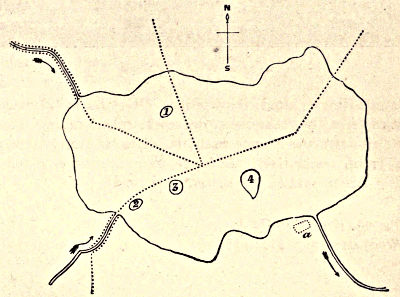 [210] Holly Island, in Lough Erne, had evidently been fortified; it is situated within a mile of Enniskillen, and in summer-time distinct traces become visible of the stockade by which it had been defended on the side facing the mainland; the island itself is, however, of entirely natural formation.