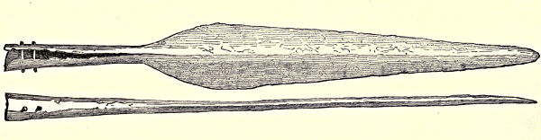 The remaining bronze weapons from Toome Bar, now in the Museum, R. I. A., are therein numbered as follows:—No. 1, a long and perfect leaf-shaped sword-blade, narrow above the handle, and with a central mid-rib; no side bevel, broad edges to handle-plate, which had been probably covered with gold; there is a longitudinal perforation instead of rivet-holes; length 26½ inches, by 1⅝ broad in the widest part of the blade. No. 2 is also in a perfect state. No. 3 has a plain, smooth blade, with a slight rib within margin, hilt cleft, nine holes in handle-plate; 24⅝ inches long, by 1⅝ broad. No. 4 is composed of bright Dowris-coloured metal, smooth and narrow above handle-plate, which has four perforations; the length is 23¾ inches, by 1¾ broad. No. 10 has an imperfect handle, notched for hilt, bevel edge, six rivet-holes; length 20 inches, by 1¾. No. 122 is a small sword, rapier blade, narrow handle-plate; 16 inches by 1⅞. No. 147 is a rapier-shaped dagger-blade; wants point, has two rivet-holes, one rivet still in position; 8⅝ inches in length.