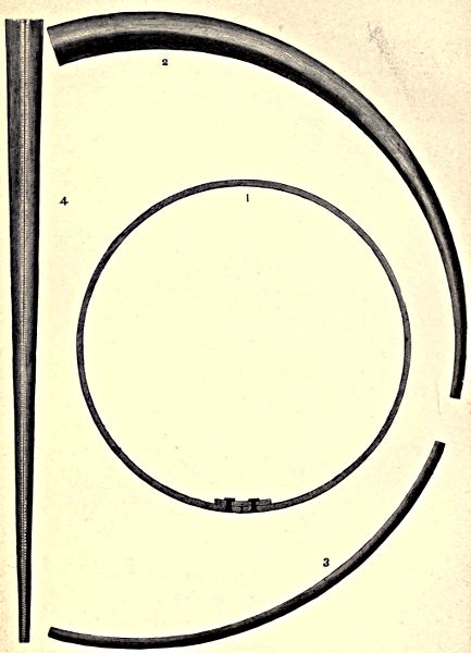 [242] In the Museum, R. I. A., Nos. 297 to 302, are stone celts from this crannog, and amongst the miscellaneous bone articles Nos. 1 to 4, and 18, are bone hafts or handles, one of them stained black, and ornamented by spiral and interrupted grooves. There are two horn tines, artificially shaped, and No. 40 is a shank-bone of a sheep or goat, stained black, highly polished, and perforated at one end. Besides the celebrated bronze shield described (ante, p. 71), the following antiquities are recorded as having been discovered in this site:—“A long, narrow, spear-head of bronze, in excellent preservation, the socket—circular in form—measuring nearly twenty-three inches in length, and two one-eighth inches in breadth at base of blade, along which there is a ridge with a feather edge running into flat compressed loops at the junction of blade and socket. A bronze spear-head, slightly defective in socket, but blade perfect; it was found with a portion of the charred handle remaining in it. A very small dagger-blade of bronze, with wide notches in the handle-plate. A bronze tube, probably the ferrule-end of a spear, and having a rivet-hole.”—Cat. Mus., R. I. A., pp. 487, 507-517.