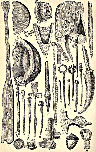 | Grain-rubbers. Querns. Human remains. Fireplaces on the shore. Pottery. Wooden vessels. Drinking cups. Wooden mallets. “Whorls.” Colouring-matter. Spinning. | |