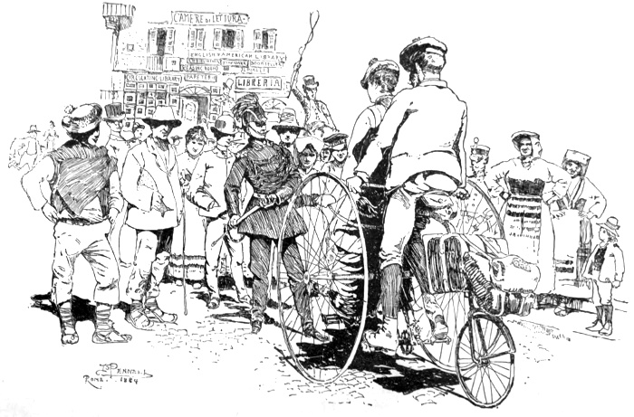 [pg 125] At the station J. met me. He had been waiting an hour, having made the thirty-six miles between Cortona and Perugia in three hours and a half. He too had had his adventures. Beyond Passignano he met a man on foot who spoke to him, and to whom he said, "Buon Giorno." "Good-morning," cried the man in good cockney English, and J. in sheer astonishment stopped the tricycle. The tramp—for tramp he was—explained that he was an Englishman and in a bad way. He had been at Perugia with a circus which had little or no success, and the rascally Frenchman who managed it had broken up and made off, leaving him with nothing. He was now on his way to Florence, where he wanted to be taken on by Prince Strozzi, who kept English jockeys. But in the mean time he was hungry and had no money, and must tramp it all the way. J. bethought him of the card to the gentleman of Cortona who had married an English wife. We had not used it, and it seemed a pity to waste it. The English lady doubtless would be glad of an opportunity to help a countryman. So he gave it to the [pg 126] tramp, together with a franc for his immediate wants. The latter looked at the money. He supposed he could do something with it, he grumbled. He really was grateful, however, for he offered to push the machine up a hill down which he had just walked. But J. telling him to hurry on, engaged instead the services of a small boy who was going his way. For pay, he gave the child a coast down the other side into his native village, than which soldi could not have been sweeter. Did not all his playmates see him ride by in his pride?