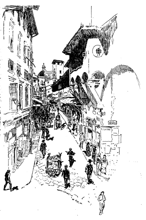 Our road for some distance went over streets laid with the great stones of the old Tuscan pavement,—and for tricyclers these streets are not very bad going,—between tall gray houses, with shrines built in them, and those high walls which radiate from Florence in every direction, and keep one from seeing the gardens and green places within. Women plaiting straw, great yellow bunches of which hung at their waists, and children greeted us with shouts. Shirtless bakers, their hands white with flour, and barbers holding their razors, men with faces half shaved and still lathered, and others with wine-glasses to their lips, rushed to look at this new folly of the foreigner,—for ours was the first tandem tricycle ever seen in Italy. At Signa, on the steep up-grade just outside the town, we had a lively spurt with a dummy engine, the engineer apparently trying to run us down as we were about to cross the track. After this we rode between olives and vineyards where there were fewer people. There was not a cloud in the sky, so blue overhead [pg 17] and so white above the far hill-tops on the horizon. The wind in the trees rustled gently in friendliness. Solemn, white-faced, broad-horned oxen stared at us sympathetically over the hedges. One young peasant even stopped his cart to say how beautiful he thought it must be to travel in Italy after our fashion. All day we passed gray olive-gardens and green terraced hillsides, narrow Tuscan-walled streams dry at this season, and long rows of slim straight poplars,—"white trees," a woman told us was their name. Every here and there was a shrine with lamp burning before the Madonna, or a wayside cross bearing spear and scourge and crown of thorns. Now we rode by the fair river of Arno, where reeds grew tall and close by the water's edge, and where the gray-green mountains rising almost from its banks were barren of all trees save dark stone-pines and towering cypresses, like so many mountains in Raphael's or Perugino's pictures. Now we came to where the plain broadened and the mountains were blue and distant. Mulberries the peasants had stripped of their leaves before their time, but not bare [pg 18] because of the vines festooned about them, broke with their even ranks the monotony of gray and brown ploughed fields. Here on a hill was a white villa or monastery, with long, lofty avenue of cypresses; there, the stanch unshaken walls and gates of castle or fortress, which, however, had long since disappeared. It is true, all these things are to be seen hastily from the windows of the railway train; but it is only by following the windings and straight ways of the road as we did that its beauty can be worthily realized.