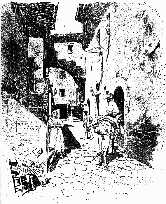 We were glad to see Cività Castellana. One or two men in answer to our questions had told us we were close to it, but we did not believe them. The fields seemed to stretch for miles before us, and there was not a house or tower in sight. But suddenly the road turned and went down-hill, and there below was the city perched on tufa cliffs, a deep ravine surrounding it. Two carabinieri, in cocked hats and folded cloaks like the famous two solitary horsemen, were setting out on their night patrol. Vespers were just over in the church near the bridge, and along the way where happy little Etruscan schoolboys once whipped homewards their treacherous schoolmaster, little Italian boys and girls, let loose from church, ran after us, torturing us with their shrill cries. [pg 162] Soon their elders joined them, and we were closely beset with admirers. The town too was in a hubbub about us, and in the streets through which we wheeled, men and women came from their houses to follow in our train. At the door of the Albergo, where we were detained for several minutes, the entire population collected. We had difficulty in getting a room. The festa, the padrone said, had brought many country people into the town, and the inns were full to overflowing. If J. would go with him he would see what could be done for us. The search led them through three houses. In the mean time I kept guard over the machine. It was well I did, for once J. had gone the natives closed upon me. Toddling infants and gray-haired men, ragged peasants and gorgeous officers pushed and struggled together in their desire to see. Every now and then a stealthy hand was thrust through the crowd and felt the tire or tried the brake. I turned from left to right crying, "Guarda! Guarda!" I lifted exploring hands from the wheels. But in vain. What was one against so many? A man sitting in the doorway took pity on my [pg 163] sad plight. He came out, and with a stick mowed the people back. Then J. returned, having found a room in the first house, which the padrone had thought fit to conceal until the last.