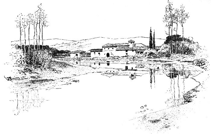Our way was through the beautiful Val di Chiana, no longer pestilential and full of stenches as in Dante's day, but fresh and fair, and in places sweet with clematis. There were no fences or hedges, and it stretched from mountains to mountains, one wide lovely park. About half-way to Castiglione we came to the boundary line between Tuscany and Umbria,—a canal with tall poplars on its banks, throwing long reflections into the water below, where a boat lay by the reeds. We stopped there some little time. Sandrino was polite, but I could see he did not approve. What would the Speedvell Cloob have thought? Farther on, when we waited again near a low farm-house under the oaks, he wheeled quickly on. But presently he came back. "Oh," he said, "I thought you must have had an accident!"