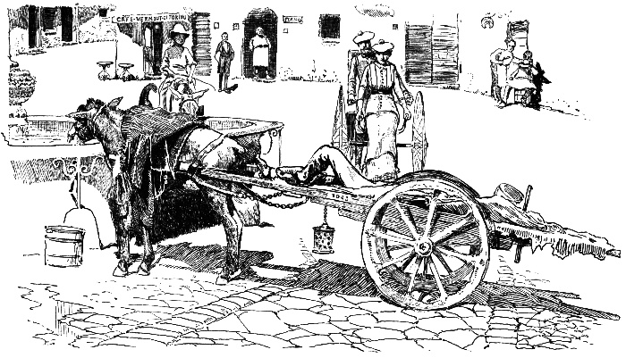 It is better not to be jocund with the fruitful grape in the middle of the day when one is tricycling. The cognac we had taken at lunch, weak as it was, and the vermouth made us sleepy and our feet heavy. I sympathized with the men who lay in sound slumbers in every cart we met. But their drowsiness forced us into wakefulness. Of the ride from Certaldo to Poggibonsi, I remember best the loud inarticulate cries of J. and his calls of "Eccomi!" as if he were lord of the land, to sleeping drivers. The Italian cry of the roads, rising to a high note and then suddenly falling and ending in a low prolonged one, which is indispensable to travellers, is not easy to learn. J.'s proficiency in it, however, made him pass for a native when he limited himself to howling. But often donkeys darted into ditches and oxen plunged across the road before the peasants behind them awoke. Like Sancho Panza they had a talent for sleeping.