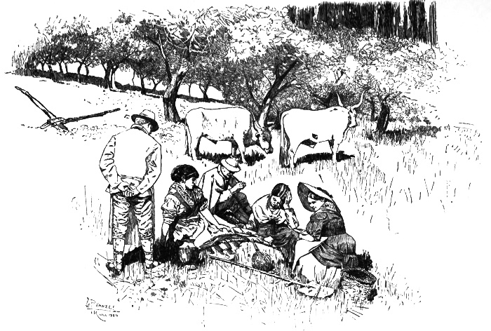 The rest of our way was divided between walking and riding. The woods with their solitude and wildness, but not the good road, came to an end. Once beyond them, we wheeled out by fields where men and women were at work, their oxen whiter than any we had yet seen, by contrast with the rich red of the upturned earth. In olive-gardens peasants were eating their midday meal; men with white aprons, women with enormous Sienese hats, and dogs and oxen were all resting sociably together. By the roadside others were making rope, the men twisting and forever walking backwards, a small boy always turning at the wheel. Scattered on the hill-tops and by the road were large red-brick farm-houses, instead of the white ones we had seen near Florence.