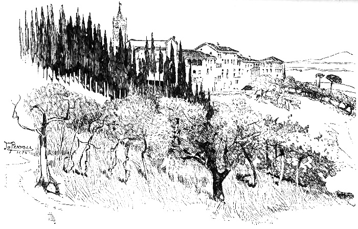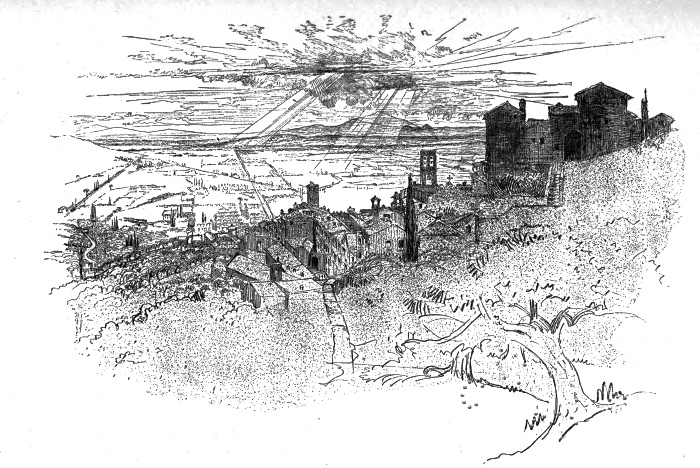 For the last few days we had begun to be haunted by the fear of the autumn rains. If they were as bad as Virgil says, and were to fall in dense sheets, tearing the crops up by the roots, while black whirlwinds set the stubble flying, and vast torrents filled ditches and raised rivers, the roads must certainly be made unridable. Since the morning we left Monte Oliveto the weather had been threatening, and now in Cortona there were heavy showers. As we sat in our room at the Albergo after our long tramp, and J. made a sketch from the window, we saw dark clouds gradually cover the sky. The lake, so blue yesterday, was gray and dull. The valley and the mountains were in shadow, save where the sun breaking [pg 121] through the clouds shone on a small square of olives and spread a golden mist over Monte Amiata. Before J. had finished, the gold faded into white and then deepened into purple, and we determined to be off early in the morning.