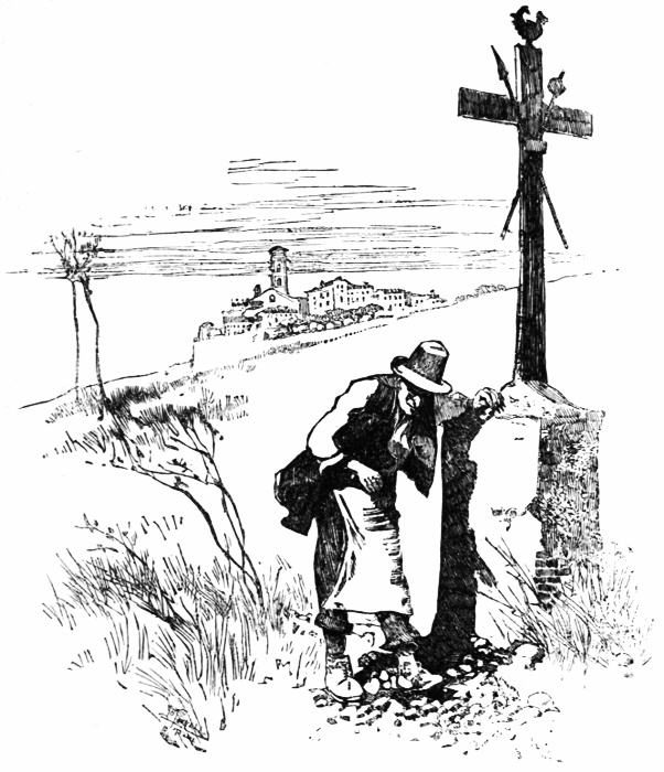 Just beyond Montelupo, when a tedious up-grade brought us to a broad plateau, a cart [pg 21] suddenly came out a little way in front of us from a side road. A man was driving, and on the seat behind, and facing us, were two nuns, who wore wide straw hats which flapped slowly up and down with the motion of the cart. When they saw us, the younger of the two covered her face with her hands, as if she thought us a device of the Devil. But the other, who looked the Lady Abbess, met the danger bravely, and sternly examined us. This close scrutiny reassured her. When we drew nearer she wished us good-evening, and then her companion turned and looked. We told them we were pilgrims bound for Rome. At this they took courage, and the spokeswoman begged for the babies they cared for in Florence. We gave her a few sous. She counted them quite greedily, and then—but not till then—benevolently blessed us. They were going at jog-trot pace, so that we soon left them behind. "Buon viaggio," the Abbess cried; and the silent sister smiled, showing all her pretty white teeth, for we now represented a temptation overcome.