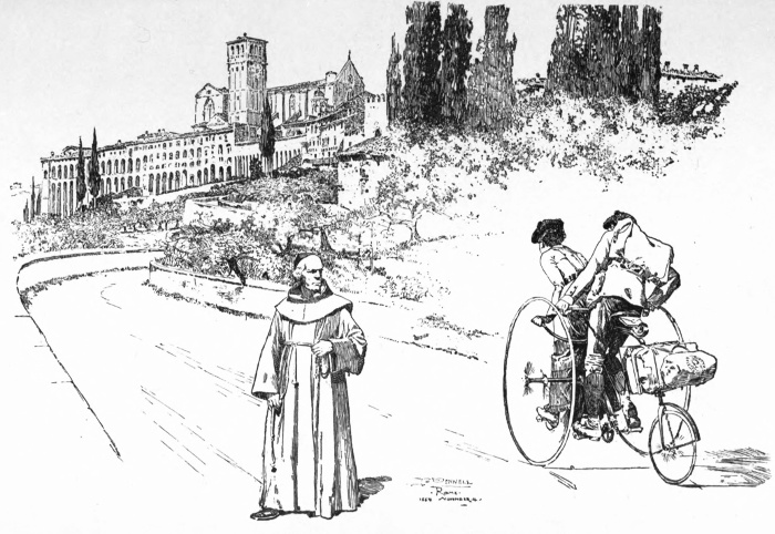 It was just noon when we reached Assisi, but we rode no more that day. We spent the afternoon in the town of Saint Francis. The Albergo we selected from the many recommended was without the large cloisters of the monastery. The waiter at once remembered that J. had been there before, though eighteen months had passed since his first visit. The Signore had two ladies with him then, he said. He was delighted with the velocipede. It was the first time in all his life he had seen one with three wheels. Nothing would do but he must show us the finest road to Rome. He spread our map on the table as we eat our dinner, and put on his glasses,—for he was a little [pg 139] bad in the eyes, he explained,—and then he pointed out the very route we had already decided upon. Ecco! here, between Spoleto and Terni, we should have a long climb up the mountain, but then there would be seven miles down the other side. Ah! that would be fine! This long coast to Terni was clearly to make up for the hardships we already had endured on toilsome up-grades.
