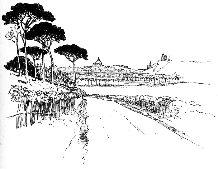 And after this "the hills their heights began to lower," and with feet up we went like the wind, and every time we looked at the dome it [pg 170] seemed larger and more clearly defined against the sky. But about six miles from Rome our feet were on the pedals again and we were working with all our might. Sand and loose stones covered the road, which grew worse until, in front of the staring pink quarantine building, the stones were so many that in steering out of the way of one we ran over another, and the jar it gave us loosened the screw of the luggage-carrier. We were so near Rome we let it go. This was a mistake. But a little farther, and the whole thing gave way, and bags and knapsack rolled in the dust. It took some fifteen minutes to set it to rights again; and all the time we stood in the shadeless road, under a burning sun, for the heat in the lower plains of the Campagna was as great as if it were still summer. As the luggage-carrier was slightly broken, we were afraid to put too great a strain upon it, and for the rest of the journey the knapsack went like a small boy swinging on behind.