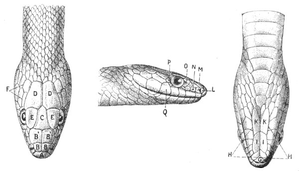 | Fig. 13— | Arrangement of the scales of the head in one of the non-poisonous Colubridæ (Ptyas mucosus) | 14 |