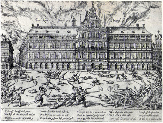 Abb. 2. Franz Hoogenbergh, Der Brand des Rathauses von Antwerpen 1576. Radierung (208×276 mm) aus dem Werk: Mich. Aitsingers: »De leone belgico Topographia«. Cöln 1583. – Der Plünderung durch die Spanier fielen an 7000 Menschen zum Opfer. Das Rathaus war nur 10 Jahre früher durch Corn. de Vriendt vollendet worden. 5 Jahre später wurde es wieder hergestellt.