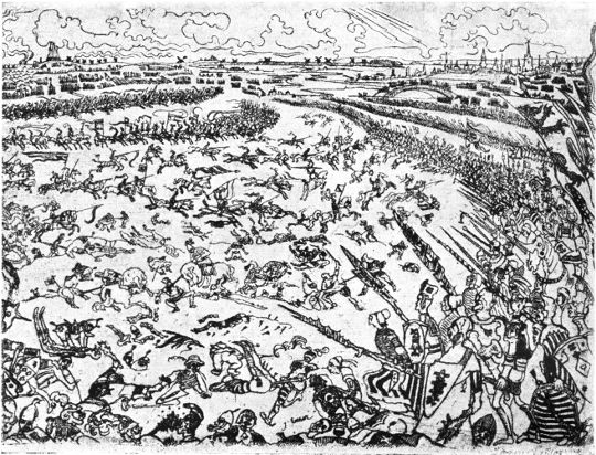 Den alten Breughel nennen mit vollem Rechte die Belgier selbst den echten, volkstümlichen flämischen Künstler. Er ist wie Rubens Realist und Phantast – aber Rubens ist nie Humorist, nie der milde, verstehende Spötter wie der geistig festere Breughel. Von den vielen grausamen Schildereien Breughels ist ein Stich nach ihm (Abb. 13) bezeichnend für die furchtbare Zeit, bezeichnend für das Sehen dieses bahnbrechenden Belgiers.