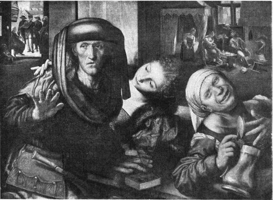 Abb. 44. Jan Sanders van Hemessen. Lockere Gesellschaft. Original im Gh. Museum zu Karlsruhe (81×110). Hemessen bei Antwerpen geboren (um 1504) zog später nach Haarlem († 1566). Das Lob seiner Zeitgenossen als »holländischer Raffael« trifft die üble Zwiespältigkeit seiner Kunst. Es gibt kein schlechteres »Lob« für einen Nordischen.