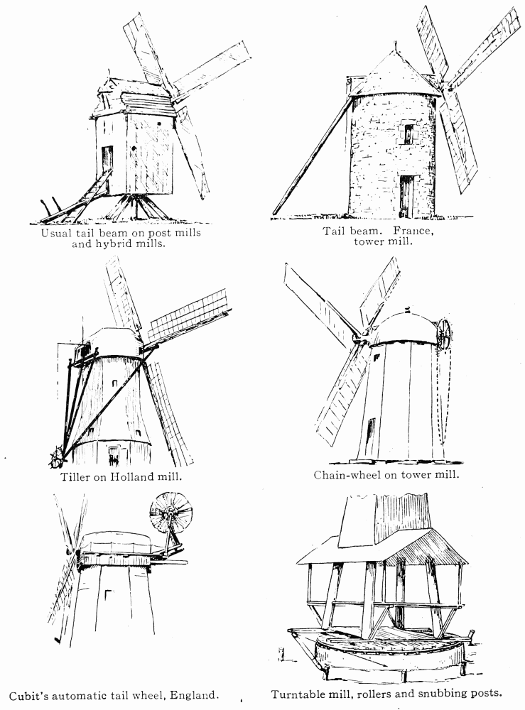 The crude structures of Greece and Turkey, already mentioned, are so crude that often no device is provided for turning to the wind, but, on the contrary, four mills are sometimes built in a field, facing, respectively, north, south, east and west; so that whichever way the wind comes some power can be secured. It is, however, more likely that prevailing winds are so constant{193} from one quarter there is but little use for a turning device, resulting in its omission.