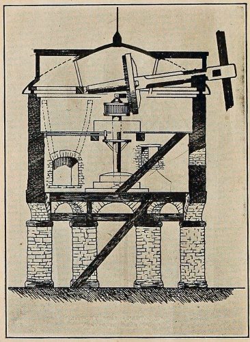 The steam engine came into use in the early part of the nineteenth century. By 1825 most of the principal English cities had it in use. Before that period, and dating back to remote ages, the only sources of power—other than man or bullocks, etc.—were the two great forces of wind and water. But only countries of waterways and varying levels afforded waterfalls; while the wind was universal. Therefore, while water wheels were in use in parallel periods with the oldest of windmills, in number they were infinitely less, so that one can properly say that the world’s motor for some eight centuries was the old-time windmill. These eight centuries are from about 1000 to 1825, when, with the advent of Watt’s invention, the zenith of windmill design and use had been attained. After that date they so declined that in fifty years not only had new construction ceased, but the old structures in very large measure had fallen into decay and{172} abandonment. It is evident from the above that an account of this old, picturesque, historic and effective tool of mankind should have some interest, both from the standpoint of engineering and that of sentiment; and it is believed that what follows will give the essential facts relating to it. It may be proper to say here that what is related applies entirely to the old-style windmill, and in no measure whatever to the modern American type of windmill, which, while cheap, effective and useful, is nevertheless a prosaic, galvanized iron, squeaky thing, of which happily the larger proportion of the millions annually made is exported out of our country!