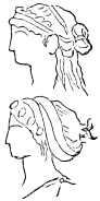 Nothing, to my mind, shows the exquisite taste of the Greeks more than the way the women arranged their hair. The bands and jewels with which the{15} hair was often adorned, rather assisted nature instead of distorting her. If we compare these classical coiffures with the frightful wigs worn by the Roman ladies under the Cæsars, or with the plaited tresses of mediæval times, or again with the powder and pomatum structures of the last century, we are struck by the great superiority of the Greek fashion.