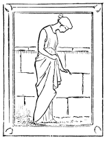 There is another garment which was sometimes worn by the Greek women over the long tunic. This was a sleeveless short tunic much ornamented, but without a girdle. We have many examples of this dress in the figures on the Greek vases. I am told that modern milliners call this kind of thing a peplum, but this is quite a misnomer. A peplum or peplon is, as we have seen, an ample shawl.