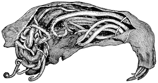A few days after eating the trichinæ, the worms multiply very rapidly in the digestive tract, from which they migrate to other parts of the body and work their way through the tissues. There is no remedy in way of treatment when affected. Prevention is the one cure. Inasmuch as five to ten per cent of hogs are affected, it is advisable that all[264] pork or ham be eaten only after most thorough cooking.