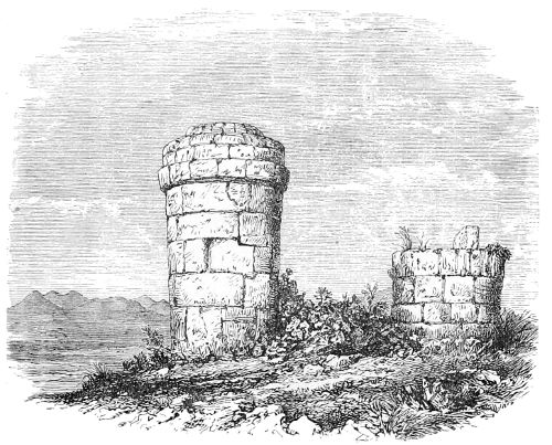 127. One of the towers in the East that bears most directly on the history of these Irish towers is that discovered by Dr. Tristram near Um Rasas. It is described and figured at page 145 in his work on the ‘Land of Moab;’ but unfortunately the woodcut is taken from the side that does not represent the doorway with the cross over it so like that at Antrim (Woodcut No. 907), and elsewhere. Like most of the Irish examples, it is situated at about 10 ft. from the ground. There is no other opening to the tower, except one on each face at the top. It has also the peculiarity that it stands free but close to a small cell or chapel, as is the case with almost all the Irish towers. The one point in which it differs from the Irish examples is that its plan is square instead of being circular. This does not seem so important as it at first sight may appear, seeing how many circular minarets were afterwards erected in the East, which must have had a model somewhere. Practically, therefore, this Moabite tower may be described, Hibernicè, as a square Irish round tower.