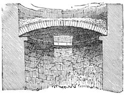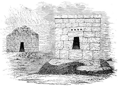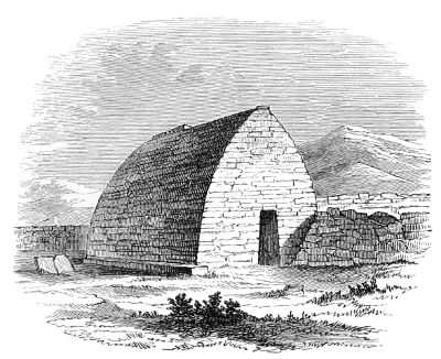 124. The Rev. Professor Stokes, in a paper communicated to the Royal Society of Antiquaries in Ireland, and published in their Journal, 1891, states: “The connexion with Egypt of the Celtic Church of these Western Islands of Britain, as well as of Ireland, cannot now be controverted.” He points out that the object of the ancient monks of the 5th and 6th centuries was “not to draw large assemblies, but to get as far away from them as possible; and assuredly they selected a lonely if not a weird spot when they selected the Skelligs.” The Professor gives a long list of places where specimens of these island monasteries can be found; the best example still existing being that of Incheleraun in Lough Ree, and commonly called Quaker Island, some ten miles above Athlone, where six or seven tiny churches just like those of Clonmacnoise (Woodcut No. 904) or Glendalough (Woodcut No. 902) still perpetuate the name of St. Dermot or St. Diarmaid, the teacher of St. Kieran, and a Celtic saint and doctor who lived just after the days of St. Patrick and St. Bridget. The monastic cells at the Skelligs, which are known as beehive huts, are sometimes square and sometimes circular in plan, in both cases covered with domical roofs of stone laid in horizontal courses similar to the Treasury of Atreus (Woodcut No. 124). In some cases those chambers are so limited in height and width that it is possible neither to stand upright nor lie down in them with ease. These beehive huts are apparently the prototypes of the oratories which, though rectangular in plan, are, like the Oratory of Gallerus (Woodcut No. 917) and St. Kevin’s Kitchen, Glendalough (Woodcut No. 902), covered with roofs of stone all laid in horizontal courses.—Ed.