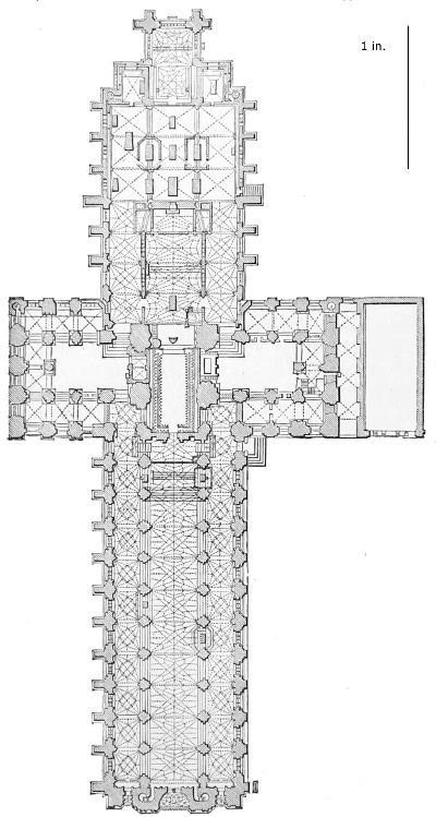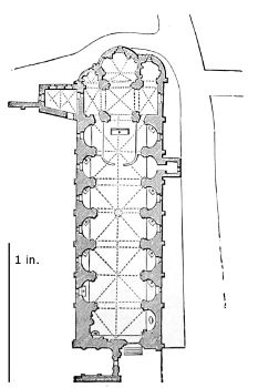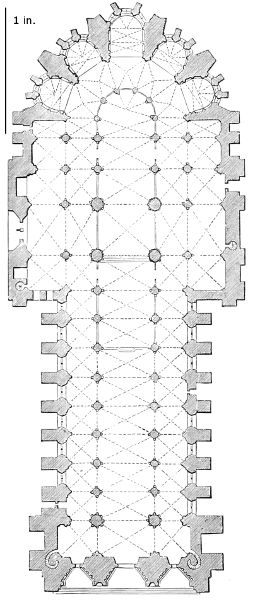 101. It should be remembered, however, that the first addition, made in 1220, was the original Lady Chapel; when Henry III. determined to rebuild the church and to adopt the plan of the French chevet, the width of the other chapels would seem to have been governed by that of the Lady Chapel. This, however, was 30 ft. wide—much greater than any French chapel. To complete the ring, therefore, he was obliged to carry them further west, so that the five chapels occupy a space equal in comparison to the seven chapels of Amiens, where the width of each is only 25 ft. A comparison of the two chevets will show how ingenious was the English arrangement; and as the vaulting is essentially English in its setting out and in its design, it is only the idea of the plan which was borrowed. On this subject Mr. Street remarks, p. 426 (‘Lectures on English Architecture,’ Memoir of G. E. Street, R.A., by A. E. Street, M.A. 1883), “Here the evidence of the building itself seems to be conclusive that the king had resolved to build a church after the model of the great French churches, but employed an English architect to design it, and he made his plan on lines which are distinct and different from those of any French church.”
