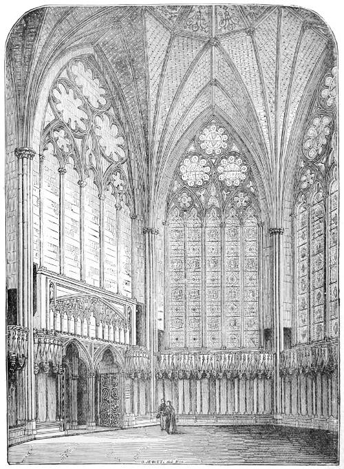 112. Few things of its class are more to be regretted than the destruction of this beautiful relic in rebuilding the Parliament Houses. It would have been cheaper to restore it, and infinitely more beautiful when restored than the present gallery which takes its place. It is sad, too, to think that nothing has been done to reproduce its beauties. When the colleges of Exeter at Oxford, or St. John’s, Cambridge, were rebuilding their chapels, it would have been infinitely better to reproduce this exquisite specimen of English art than the models of French chapels which have been adopted.